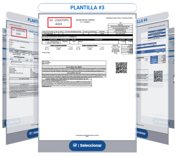 Podrás elegir entre nuestras plantillas, y personalizar tus CFDI'S. También podrás obtener diseños personalizados bajo cotización especial, donde podrás elegir desde colores, diseño, logos, etc.